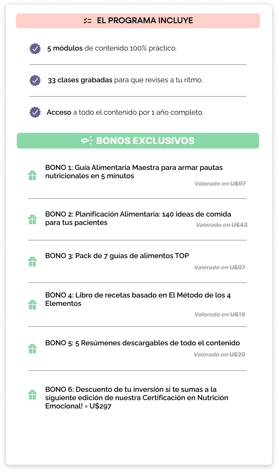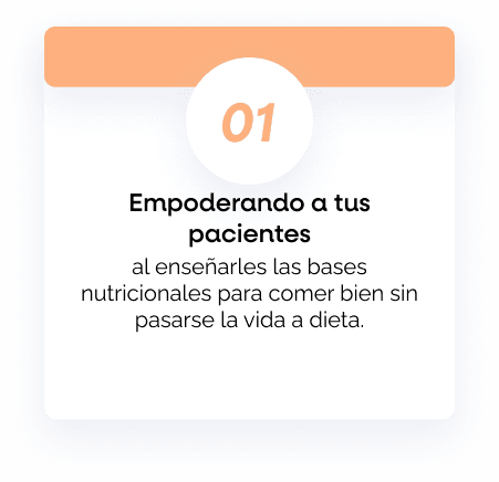 Además tendrás recursos descargables que podrás compartir con tus pacientes y te ahorrarán tiempo en consulta, que podrás dedicar a seguir formándote en Nutrición Estratégica y mejorar profesionalmente.
